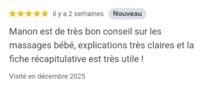 Educatrice de Jeunes Enfants et formée au massage bébé, je vous montre les gestes et vous remet une fiche récapitulative afin que vous puissiez les reproduire chez vous.